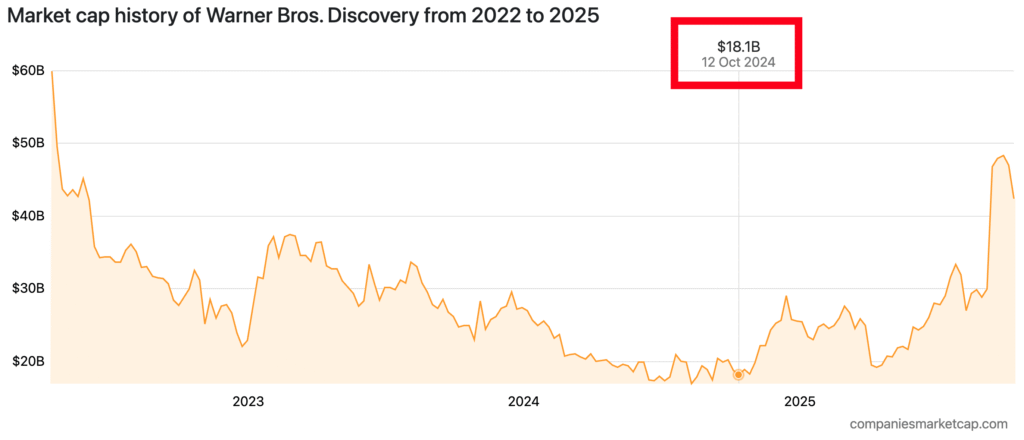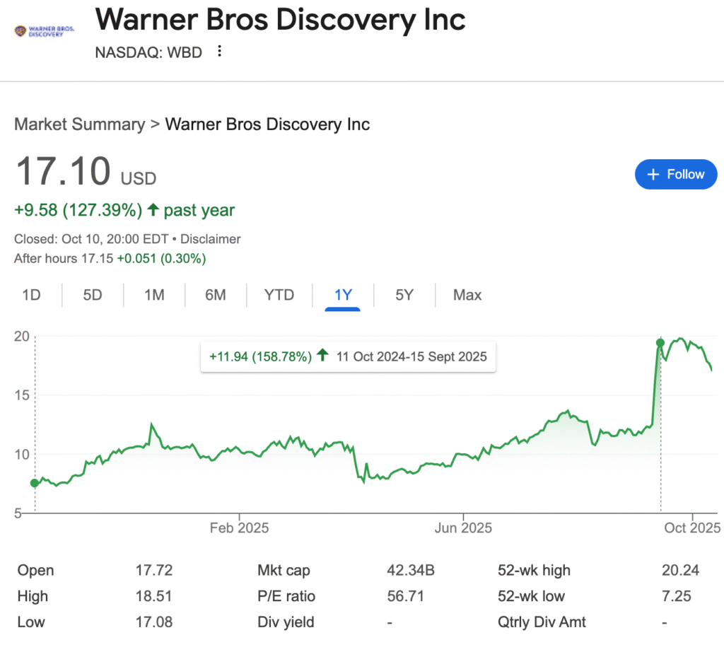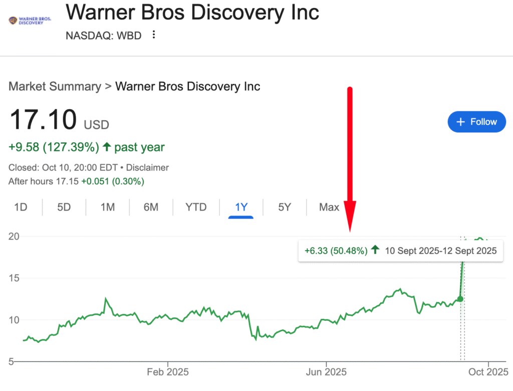И ето я развръзката от последния месец. Paramount обявиха, че ще изкупят Warner Bros и цената скочи с над 50% за 2 дни.
