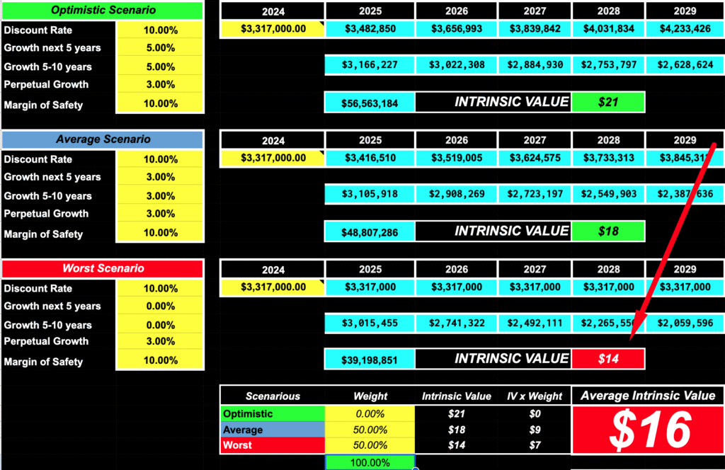 Дори при най-лошия сценарий, с никакво покачване на FCF, цената излизаше двойно – $14 за дял. Както се вижда оптимистичният сценарий изобщо го извадихме от играта и той не играе в сметките за определяне на финалната цена от $16 за дял.