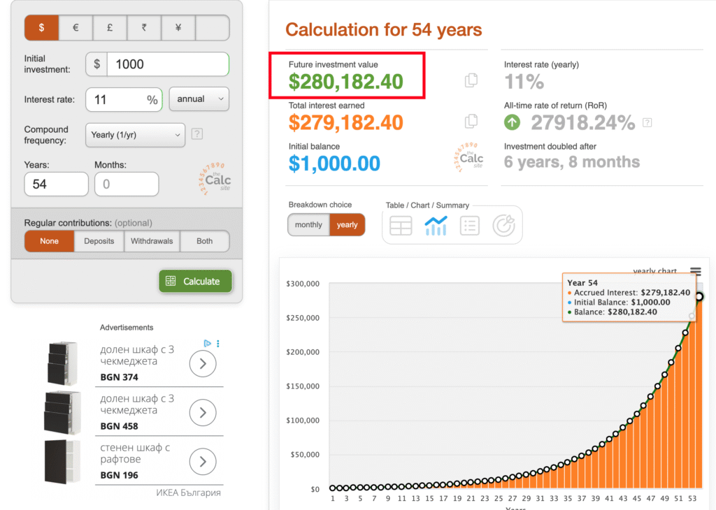 $1000 инвестирани за 54 години на 11% средногодишна възвръщаемост, са се превърнали в $280 000.