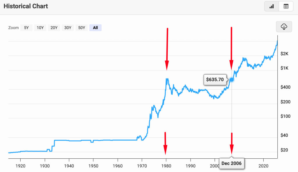 Ето една графика, която показва 26 годишният заключен период на златото от 1980 до 2006 година, когато за 26 години, който е инвестирал по върховете, просто е останал със златото си без неговата цена да се покачи за целия този период.
