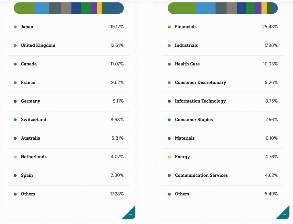 Ето го разпределението по държави и сектори. Най-голямо тегло има Япония, следвана от UK и Канада, а най-тежкият сектор е сектор финанси и след това е индустриалният сектор и сектор здравеопазване.