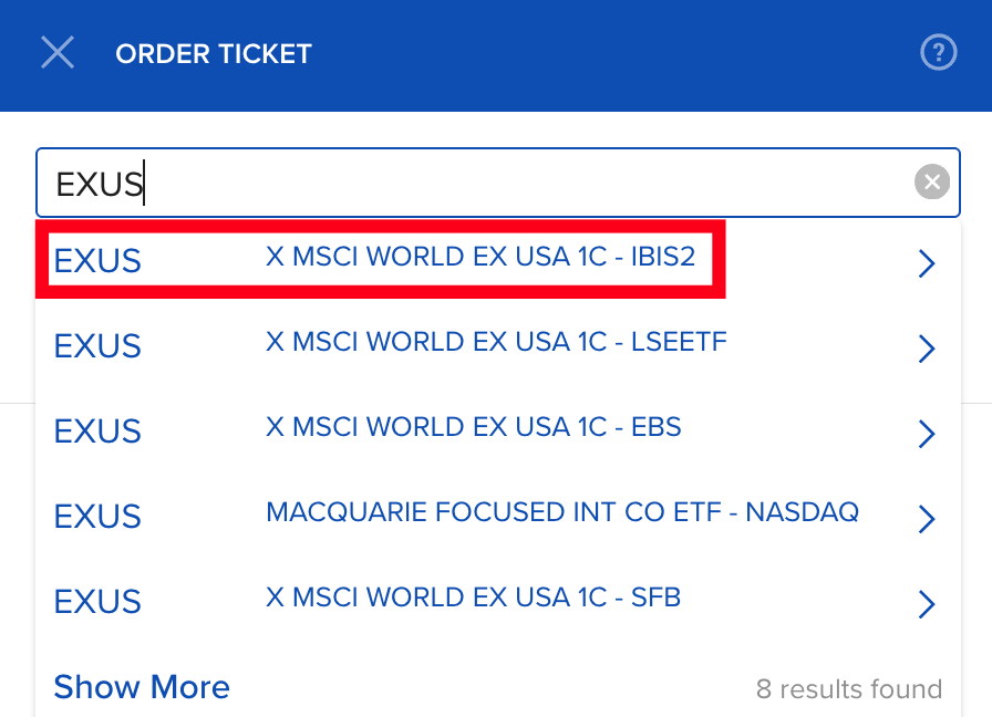Ето го ETF-a в Interactive Brokers в евро от XETRA. Написвате EXUS в търсачката и избирате IBIS 2 след тиренцето, защото това указва борсата. Не е казано, че поръчката ви ще се изпълни точно на XETRA, затова ако желаете това, трябва ръчно да я пренасочите като изпозлвате iBot, dekstop приложението на брокера – Interactive Brokers Desktop или добре познатия и не толкова user friendly TWS – Trading workstation. Погледнете съдържанието ми за Интерактив Брокерс, за да разберете как се пренасочва поръчка. Очаквайте скоро и ново съдържание за брокера.