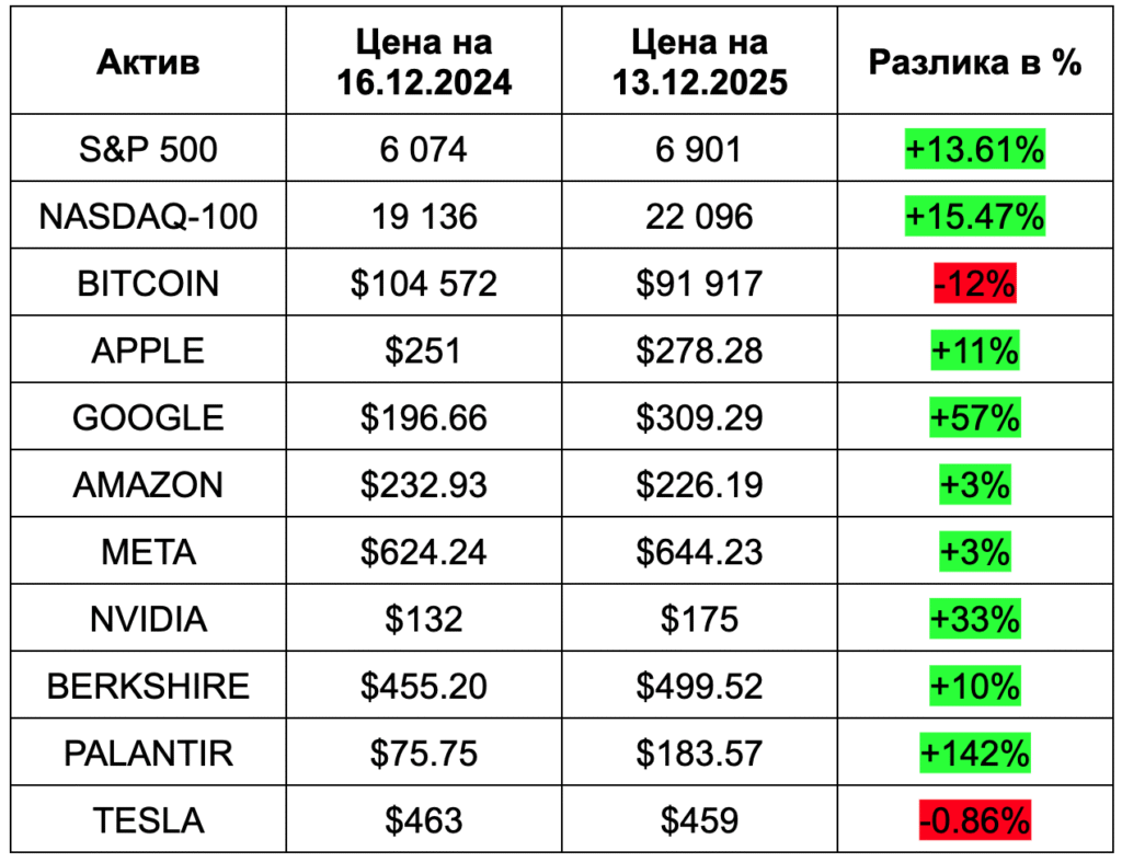 BITCOIN и TESLA дори са на минус. Но да кажем, че имахме една добра година за фондовата борса. Въпреки това, ако сме инвестирали по равно във всички тези активи, нашата по-голяма възвръщаемост ще дойде от една компания и това е Palantir. И общата ни доходност ще е над индексите, към 25% ще бъде. Но повечето хора едва ли ще имат подобни компании, едва ли ще знаят за тях. Те няма да намерят времето да се занимават и да анализират, както го правим ние в Angelov Dimitar Community и затова прекомерната диверсификация ще им навреди.