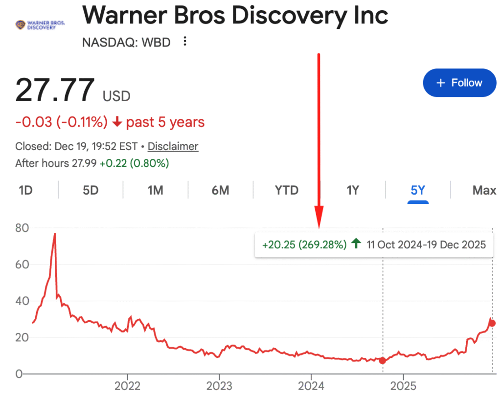 Сега ще дам пример и с няколко фирми от платформата ни за анализ, които ни се отвори възможност да купим през 2025-та. Първата съм я споменавал многократно. Това е Warner Bros Discovery. Имам даже статия и видео за нея: