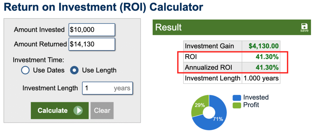 Общо нашите $10 000 са станали $14 130. Това е 41% възвръщаемост!!! Не е 16%, нали? 😉