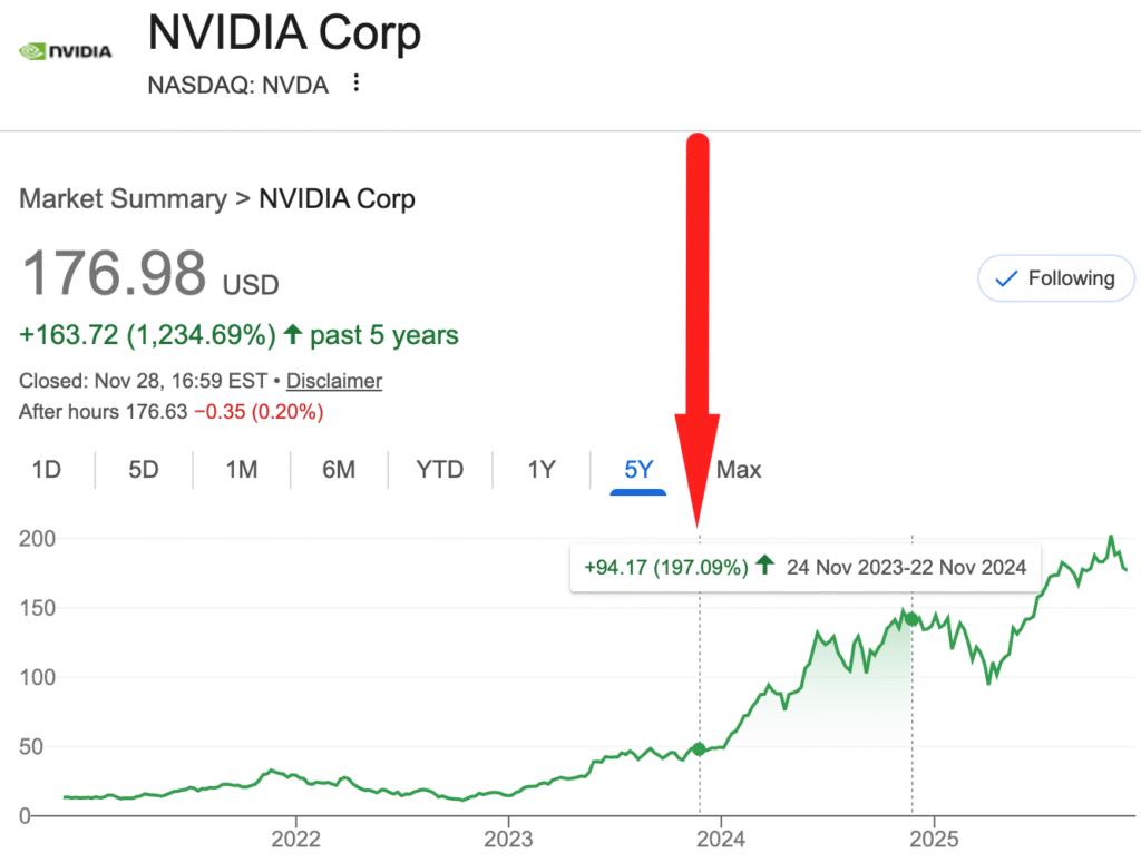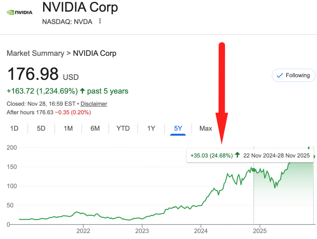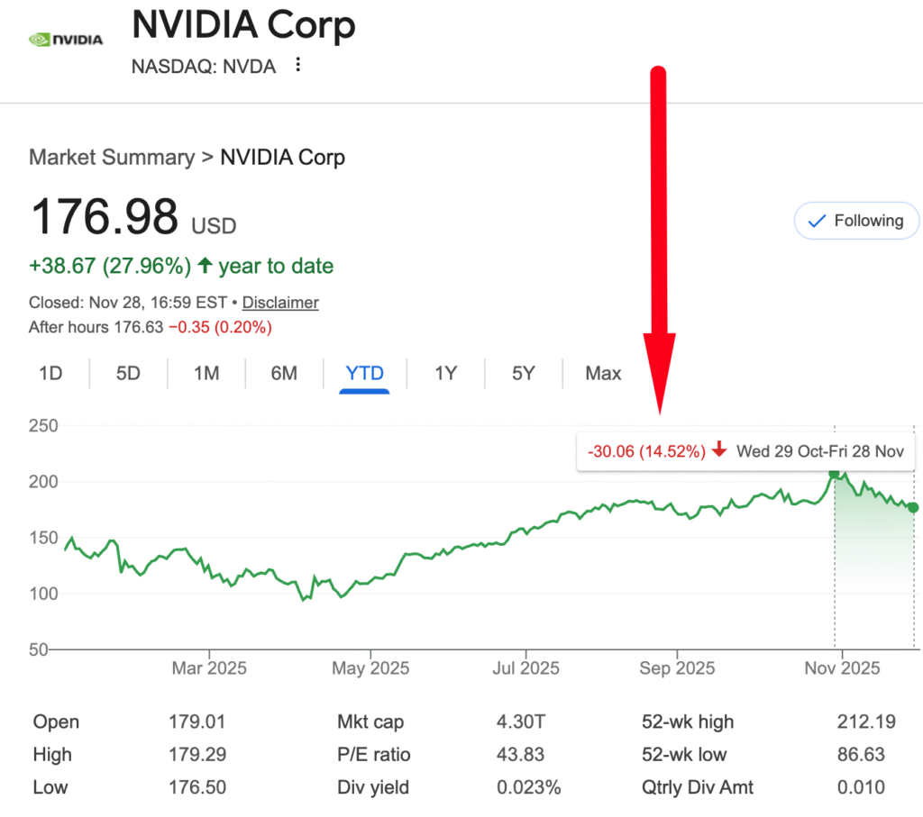 NVIDIA е с близо 15% надолу през последния 1 месец, особено откакто стана ясно, че GOOGLE правят сделки да продават собствените си чипове, TPU-тата им, на компании като МЕТА.