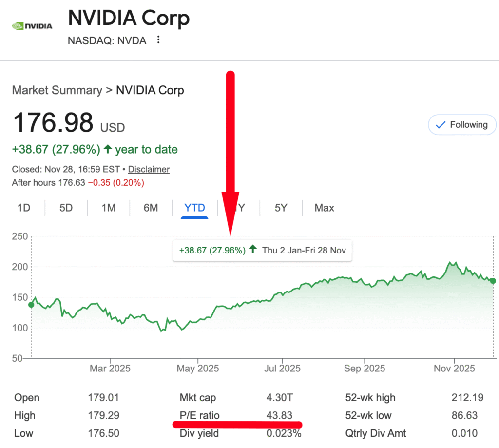 От началото на годината NVIDIA e повишила цената си с около 28%, което хич не е зле, нали? И P/E ratio на компания е около 44, което си е доста височко.