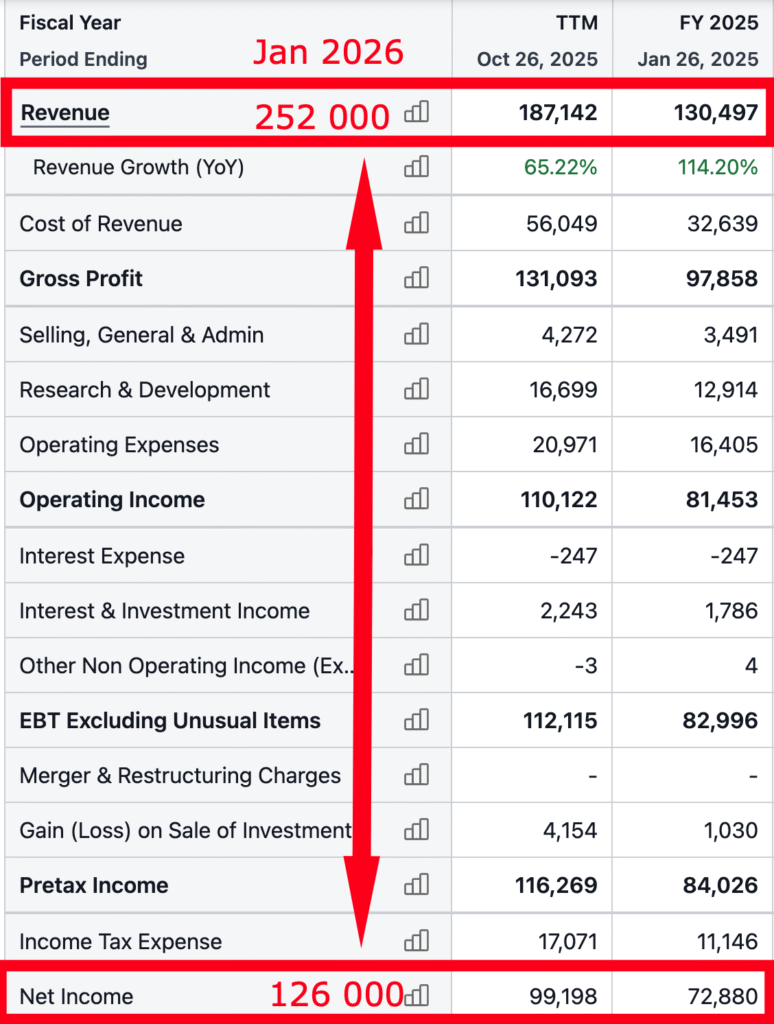 Да обаче реално за 1 година, когато ще излезе и последният отчет за последното тримесечие, се очаква NVIDIA да е удвоила оборотите си и почти да е удвоила печалбите си спрямо миналата година. Това води до Forward P/E ratio от 25! Ето как фундаментите растат двойно, а цената расте с 30%.