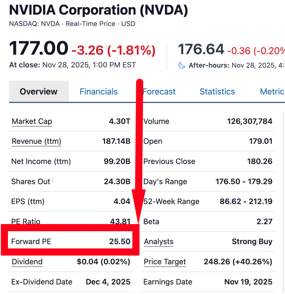 А какво беше Forward P/E ratio – ами това е просто бъдещото P/E ratio, като вземем предвид с колко ще се увеличи печалбата на дял. Обяснявам детайлно какво представлява този параметър на бялата дъска. И между другото, точно с NVIDIA го показвам във видеото 🙂