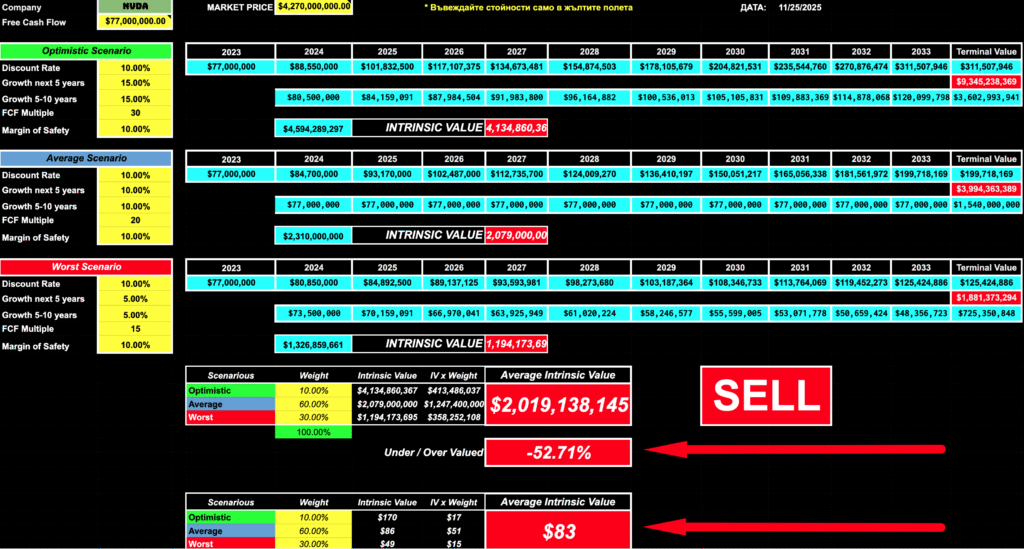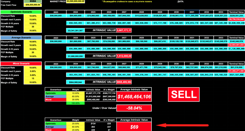 Когато въведем някакви що годе нормални прогнозируеми стойности за ръст на FREE CASH FLOW при модела на дисконтираните парични потоци, маржът на безопасност, който допускам при всички сметки и като цяло фактът, че искам да взема компанията подценена, за да може да ми изкара пари, ми показват, че NVIDIA трябва да падне поне двойно, за да си помисля аз евентуално за инвестиция в компанията.