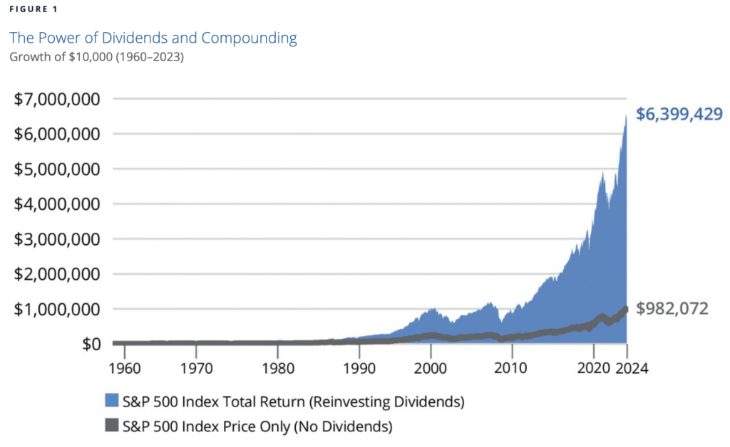 На тази графика от hardfordfunds.com е показана убийствено голямата разлика в доходността на индекса със реинвестирани дивидентите и без да са реинвестирани от 1960-та година до 2023-та година. $10 000 са се превърнали в $982 000 без да са реинвестирани дивидентите, а когато са реинвестирани, сумата е много по-голяма – над 6 милиона долара.