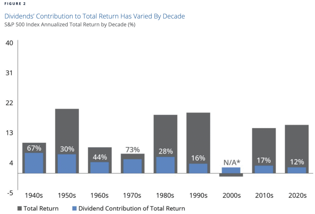 Дори, ако вземем някой основен индекс, като S&P 500, през годините дивидентите, които към момента са супер малко като процент, се вижда ясно с колко много допринасят за цялостната доходност на индекса.