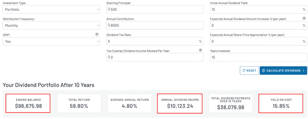 Ясно е, че от тези активи капиталов ръст не би следвало да очакваме, защото тяхната доходност идва под формата на дивиденти, които произлизат от премиите на опциите. И ето какво става, ако за следващите 10 години приемем, че ще правим DCA в някой такъв ETF с по 500 евро на месец, като няма да има ръст в цената, даже няма да има и ръст в дивидента, само ще реинвестираме дивидентите и dividend yield приемаме, че е 10%.