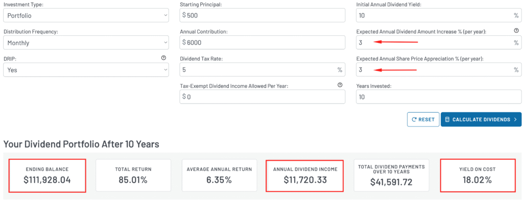 Е, не е зле, нали? Ами ако сложим малко ръст на дивидента, даже и на дяловете? Картинката ще се измени в наша полза, ама айде няма да го правим, че да не изглежда прекалено оптимистично. Или пък… защо да не го направим? Я да видим какво излиза с по 3% ръст на цената и на дивидента.