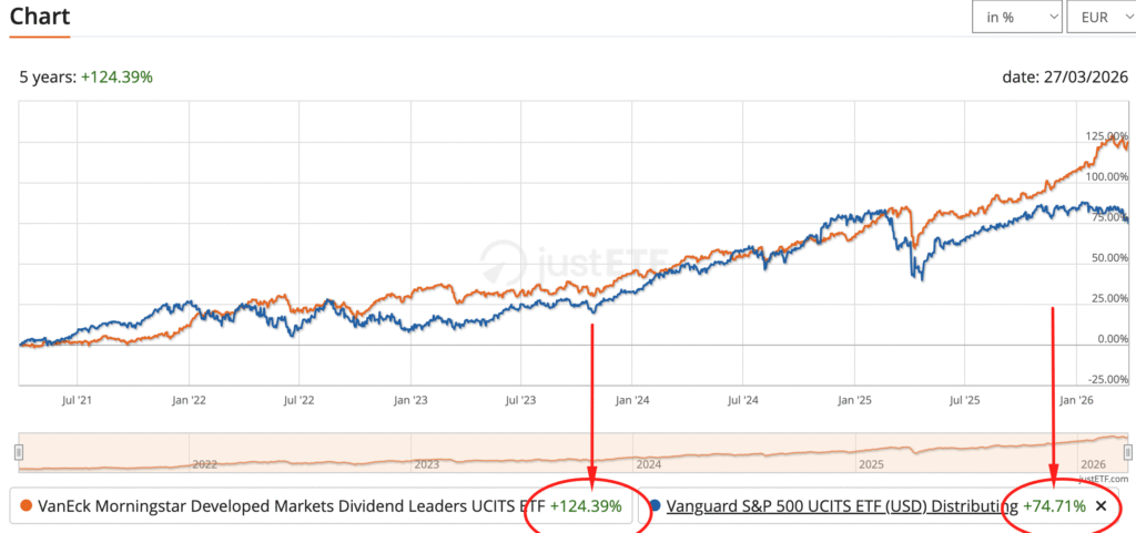 Има естествено и други ETF-и, които ви дават добра комбинирана доходност – капиталов ръст и дивиденти. Един такъв да кажем е TDIV, който за последните 5 години дори изпреварва S&P 500.