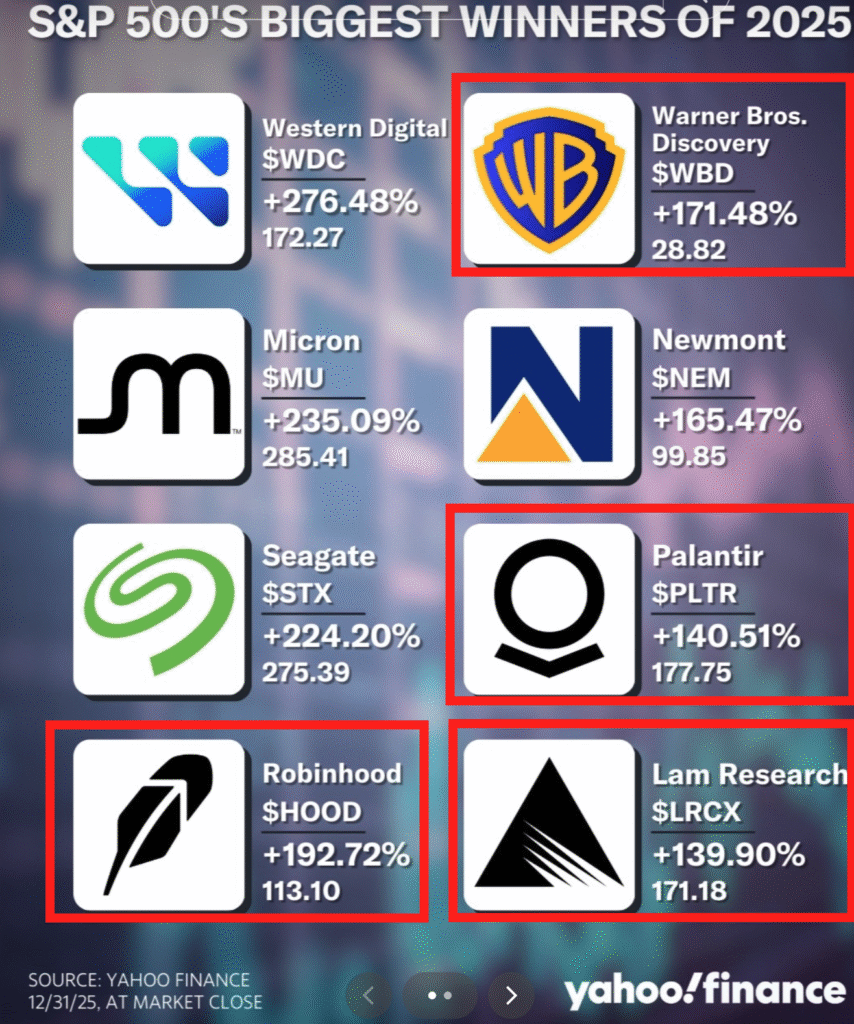 Ето ги най-големите победители в индекса S&P 500 през 2025-та. И не, тук няма NVIDIA, TESLA, APPLE, MICROSOFT или която и да е от другите известни и по-големи компании. Тук са 8 компании, които са върнали най-много (трицифрени проценти).
