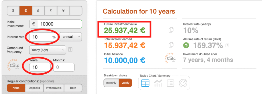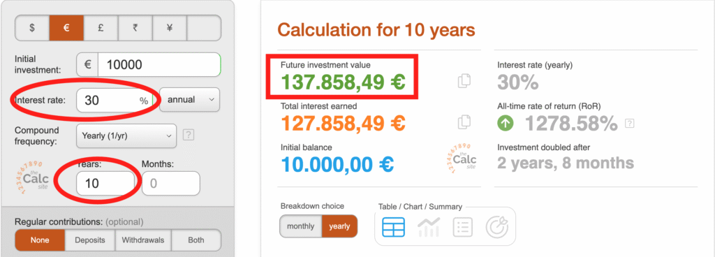 За 10 години на 10% 10 000 стават 26 000. Никак не е зле. Но за 10 години на 30% 10 000 стават 138 000! Никак не е зле, нали? 😉