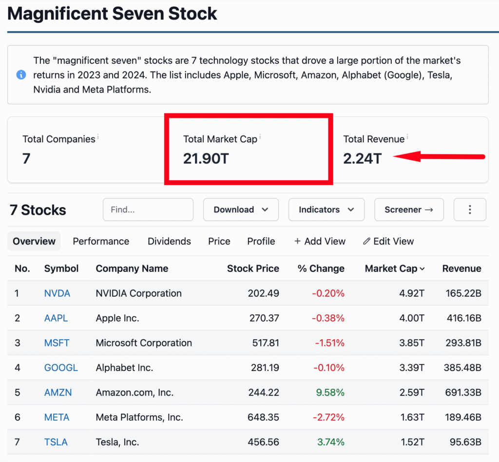 Magnificent 7 компаниите са с 35% тегло в индекса S&P 500 и обща пазарна капитализация доближаваща 22 трилиона долара! Е, и оборотите им си ги има де, $2.2 трилиона, не е злe, ама както и да е, важен е балонът! 🙂