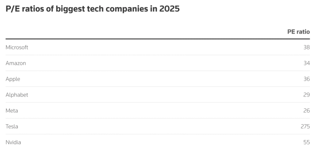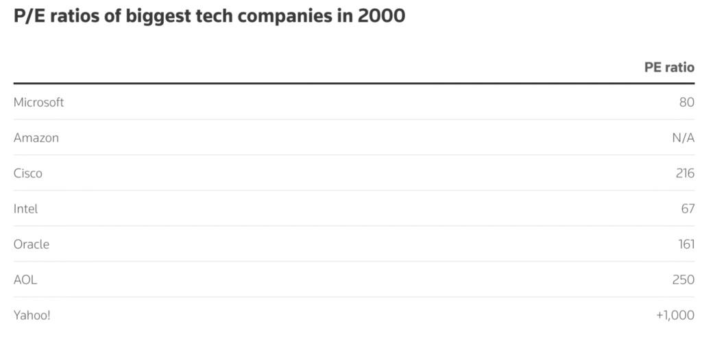 Много се тръби, че AI е еквивалент на балона през 2000-ната година. Нека ви кажа някои данни за балона тогава и за „балона“ сега. През 2000-ната година компаниите, които са се надували на дот ком балона дори са нямали печалби. Техните P/E ratio-та са били скандални, като например компанията yahoo e имала p/e ratio над 1000, Amazon изобщо не е била на печалба и другите технологични компании са били с p/e над 100 и дори над 200.