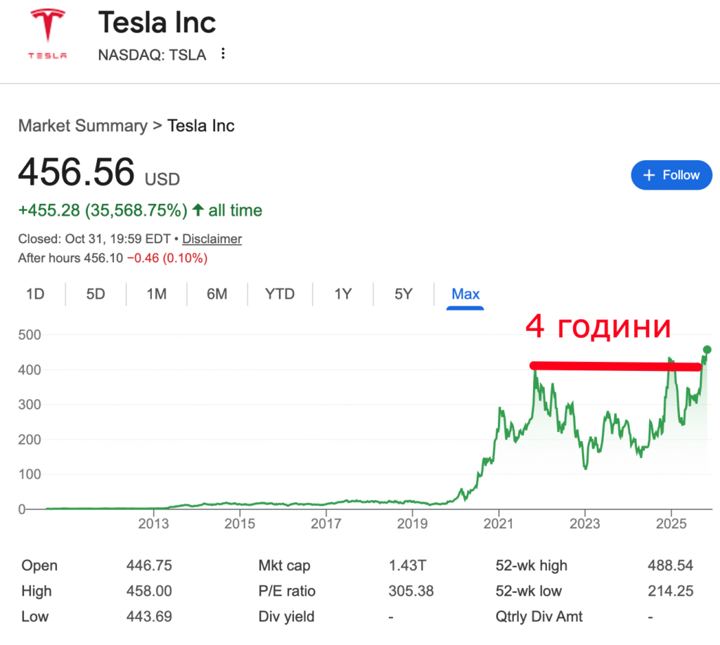 Например компанията TESLA, която при предното мега надуване през 2021-ва след спада идва горе долу на същата цена чак след 4 години. Това са 4 години липса на compounding, 4 години ЗАГУБЕНИ пари.