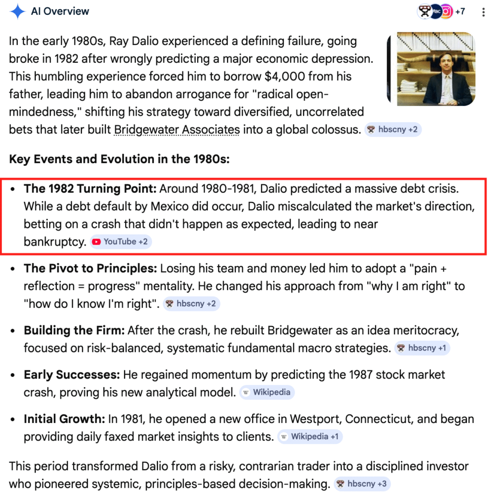 Но Далио не предвижда края на Америка и фондовата борса отскоро, т.е. той го прави доста отдавна. Има исторически архиви, които още през 80-те години показват неговите пророчески способности. Тогава той предвижда невероятна криза и залага наобратно, тоест пазарите да падат, а те видиш ли се вдигнали. Тогава той фалира и стартира наново. Но сега пак пее същата песен…